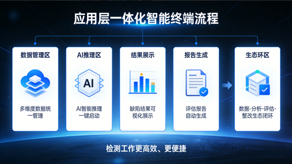 打造一體化智能終端,實現(xiàn)多維度數(shù)據(jù)統(tǒng)一管理、AI智能推理一鍵啟動、缺陷結(jié)果可視化展示、評估報告自動生成,徹底打通“數(shù)據(jù)-分析-評估-整改”生態(tài)閉環(huán),讓檢測工作更高效、更便捷。